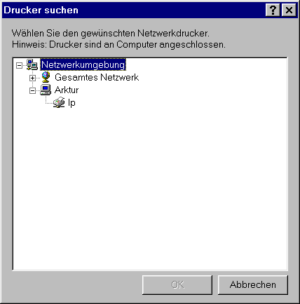 Der Drucker "lp" läßt sich von Windows 95/98 aus nutzen, indem man bei der Druckereinrichtung "Netzwerkdrucker" einstellt und ihn aus dem folgenden Dialog auswählt: