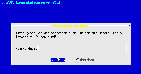 Für die Updates vorgesehen ist das Verzeichnis /var/updates . Kopieren Sie am besten die .zip oder .tgz-Archive in dieses Verzeichnis. Wählen Sie im Menü "Updates einspielen" (siehe Abbildung 6.9-1) den Punkt "HD - Archiv aus einem Verzeichnis einspielen". Der Server fragt nach dem Verzeichnis, in dem die Update-Dateien liegen. Sie können auch ein Unterverzeichnis Ihres Heimatverzeichnisses angeben.