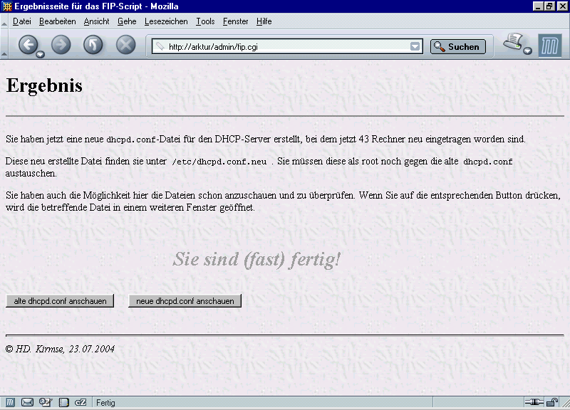Wenn Sie also den Button gedrückt haben, läuft folgendes ab: es liest die aktuelle dhcpd.conf ein, und zerlegt diese Datei so, dass die Daten für die 4 Teilnetze dazwischen geschoben werden können. Diese Daten, die das Formular liefert, werden entsprechend aufbereitet und aus beiden zusammen wird eine neue Konfigurationsdatei für den DHCP-Server erstellt und als dhcpd.conf.neu abgespeichert. Danach wird eine Seite als Ergebnis erstellt. Sie können außerdem sich diese Dateien in einem extra Fenster anzeigen lassen.