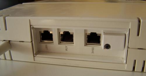 An diesen Buchsen wird das DSL-Modem angeschlossen. Sie sind für RJ45-Stecker ausgelegt. Die ATM-Buchse bleibt leer.