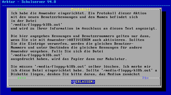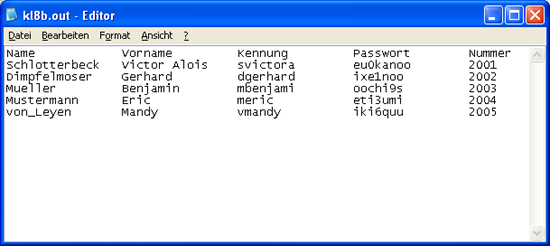 Wichtig: Der Datenträger muss beschreibbar sein, Disketten also nicht mit Schreibschutz versehen! Diese Datei erhält einen Namen in der Form "kl8b.out", also dem ursprünglichen Dateinamen und der Erweiterung ".out". Dieser Datei entnehmen Sie die vergebenen Anwenderkennungen und die Passworte, welche Sie Ihren Schülern nur noch mitteilen müssen.