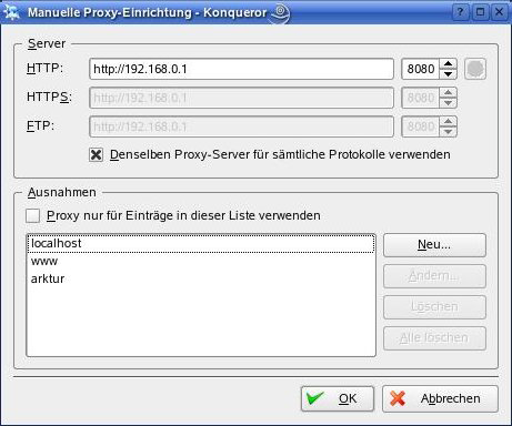 Haben Sie bei der Installation des Linux-Clients Arktur als Proxy-Server eingestellt, so wird diese Einstellung automatisch auf jeden neuen Benutzer übertragen. Damit kann dieser direkt nach der ersten Anmeldung mit dem Konqueror ins Internet gehen. Der Konqueror hat bei der Benutzerinstallation von KDE die richtigen Angaben für den Proxy bekommen.
