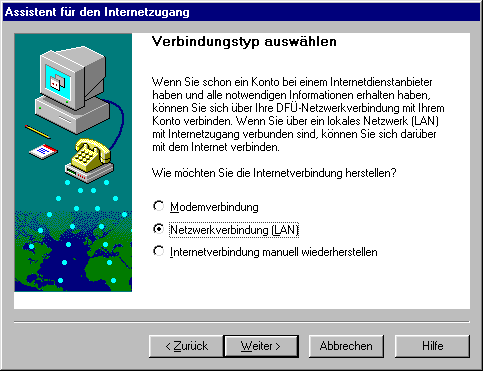 Nun müssen Sie noch den Verbindungstyp angeben. Wählen Sie hier den Punkt "Netzwerkverbindung (LAN)" aus.