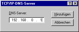 Wenn Sie sich zur festen IP-Adressen-Vergabe entschlossen haben, müssen Sie auch den Domain Name Service (DNS) konfigurieren. Wählen Sie die Registerkarte "DNS-Konfiguration". Tragen Sie bei "Domäne" den Namen ein, den Sie als Systemnamen gesetzt haben, z. B. "vhs-gi.gi.he.schule.de". Wählen Sie bei "Suchreihenfolge des DNS-Dienstes" die Schaltfläche "Hinzufügen". Tragen Sie in dem Dialogfenster "TCP/IP-DNS-Server" die IP-Adresse Arktur-Schulservers, also "192.168.0.1" ein und klicken Sie auf <Hinzufügen>.